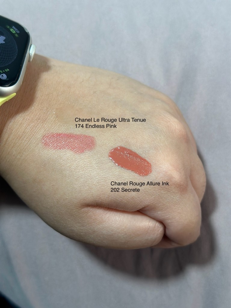 The texture is like their Rouge Allure Ink, but less mousse-y. This is side by side comparison between Chanel Le Rouge Duo Ultra Tenue in 174 Endless Pink with Chanel Rouge Allure Ink in 202 Secrete:
