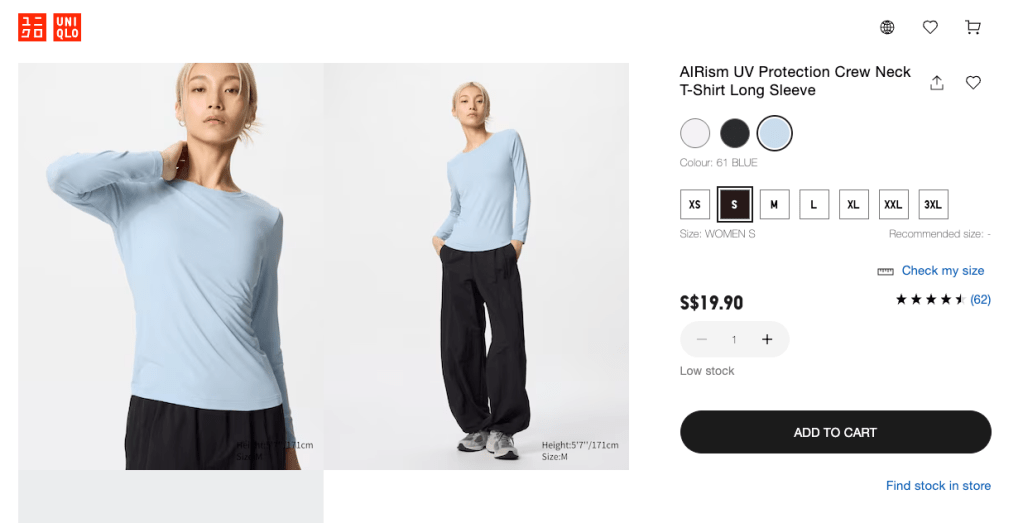 Find a good, airy shirt that offers UV protection while also keeping you cool. I use the UNIQLO AIRism UV Protection Crew Neck Long-Sleeved T-Shirt when I need to stay under the sun for a long time. The fabric is opaque but allows ventilation for the air to flow. Choose brighter colours instead of black because black absorbs heat more, making us feel hotter (and not in a good way).